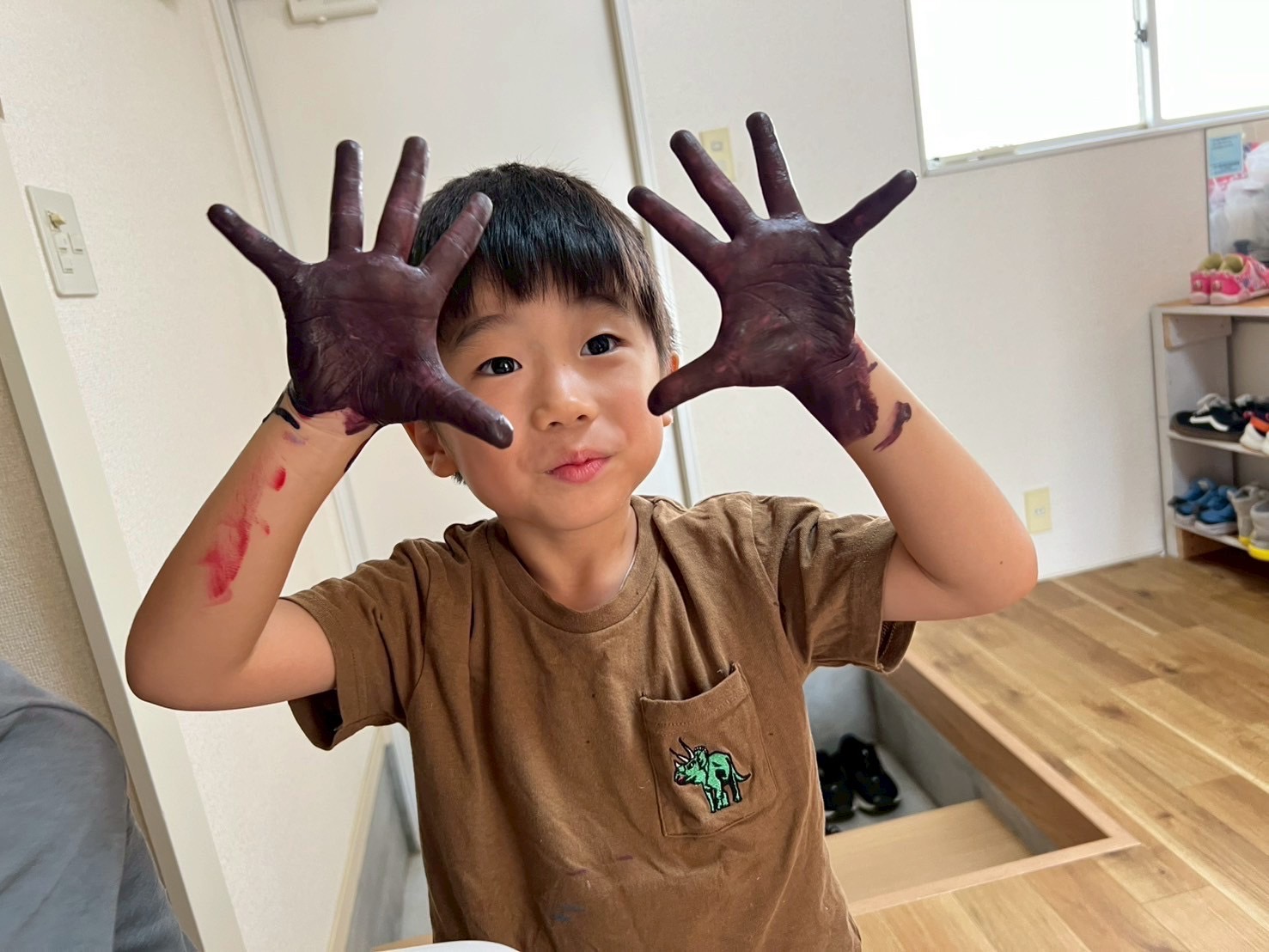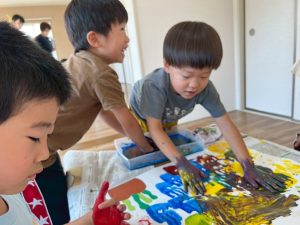 手形スタンプでは、真っ白な紙に自分の好きな色をペタペタしていきます。