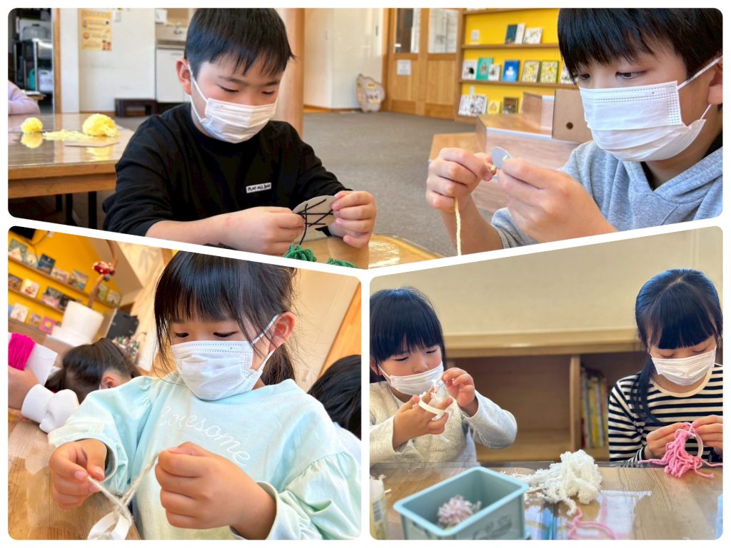 同じ毛糸が使いたいときは、お友だち同士で声を掛け合い譲り合って使う様子やお友だちの作っているものを見て「かわいい!」と感想を言い合う様子が見られました😍