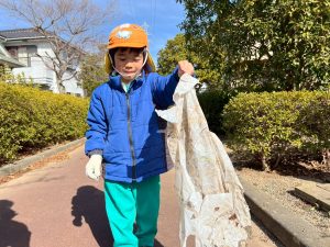 清掃活動では、小さな可愛い手に軍手をしっかりはめて出発!いつもお散歩している道を歩きはじめると、、、