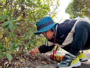 夢中になって植木の中の葉っぱをかき分け拾う子!