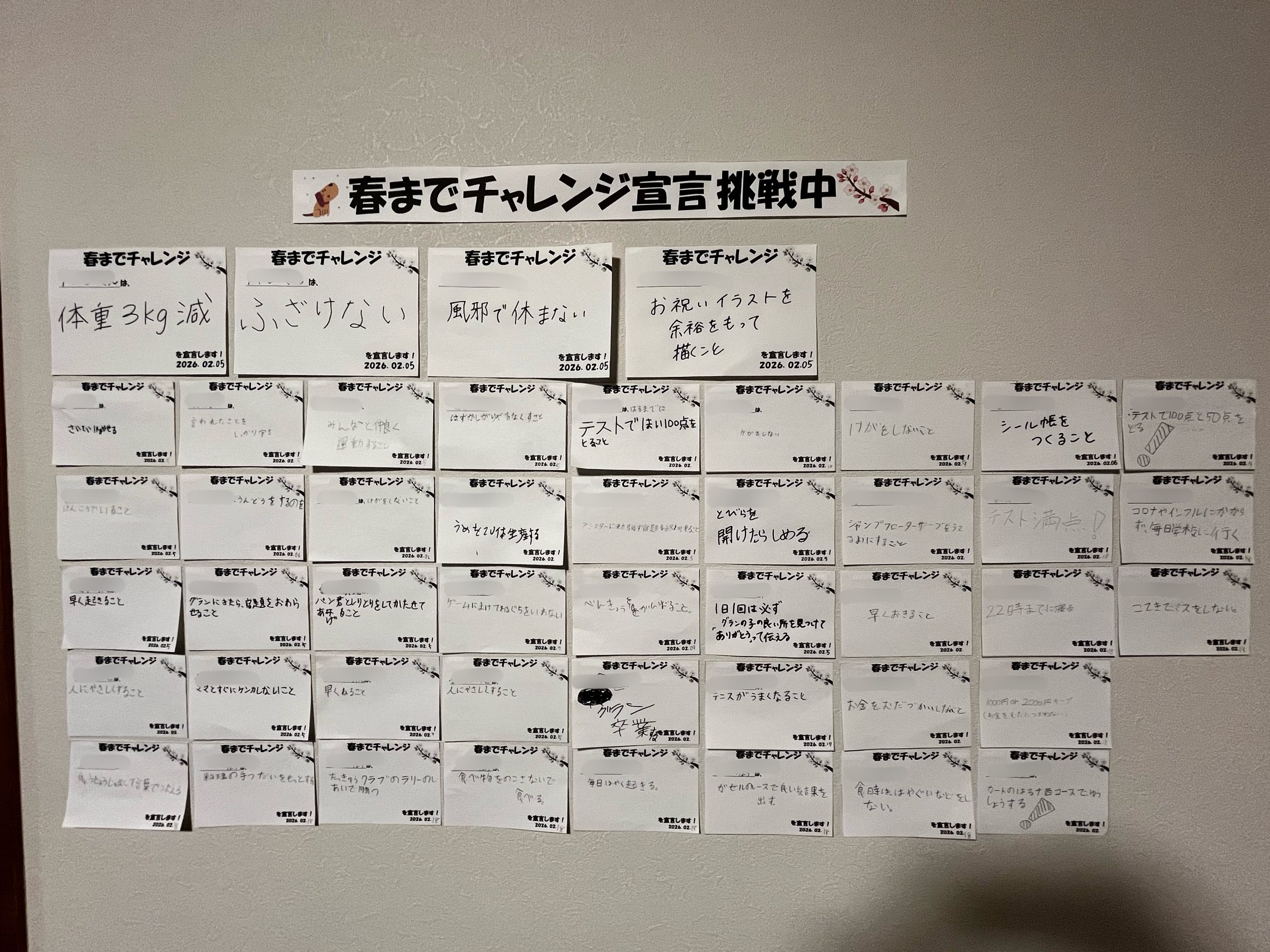 春まで『頑張りたいこと』『達成したいこと』『挑戦したいこと』『継続したいこと』など様々な目標を一人ひとり決めて宣言する活動です☺